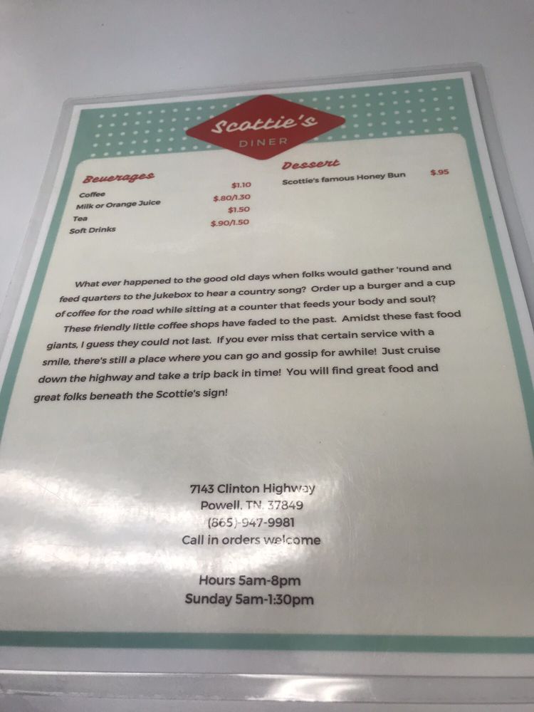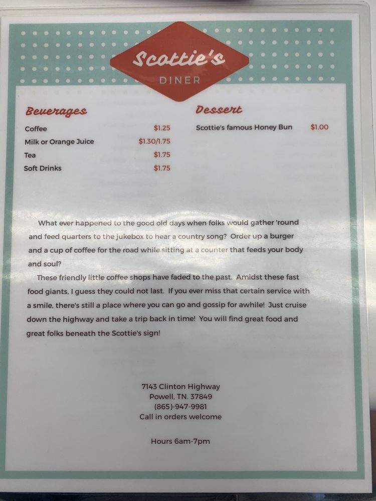 Scotties of Powell is a casual New American restaurant offering takeout, delivery, and catering services. Located in Powell, TN, this restaurant has a cozy atmosphere with outdoor seating and friendly staff. The breakfast menu features classic dishes like eggs with bacon, sausage, or ham, as well as waffles and French toast. Customers have praised the eggs cooked to perfection and the generous portions that leave you feeling satisfied. While some guests found the ambiance a bit overwhelming with loud music, others appreciated the down-home feel and fast, friendly service. Overall, Scotties of Powell seems to be a popular spot for a satisfying breakfast or lunch, with highlights being the delicious omelettes and affordable prices.